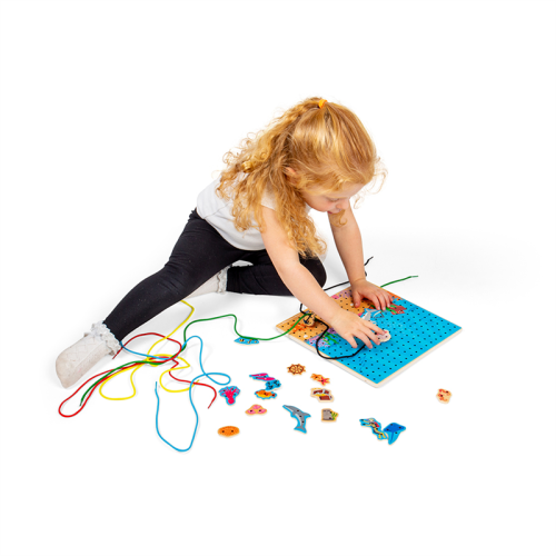 Provlékací deska moře je šněrovací hra plná zábavy. Pomocí barevných provázků dítě provléká skrz dřevěnou desku s otvory kousky motivů z podmořského světa. Může si tak vytvořit vlastní mořský svět na spoustu různých variant. Jasné zářivé barvy jsou ideální pro stimulaci představivosti. Tato zábavná provlékací hračka poskytne vašemu děťátku hodiny zábavy. Je to skvělý způsob, jak rozvíjet u vaší ratolesti koordinaci pohybů, jemnou motoriku, zručnost a trpělivost. Vyrobeno z vysoce kvalitních, zodpovědně získaných materiálů. Splňuje aktuální evropské bezpečnostní normy. Hlavní vlastnosti: 30 dílů, 6 ks tkaničekkrásné barevné zpracovánírozvíjí jemnou motorikuvhodné od 3 let