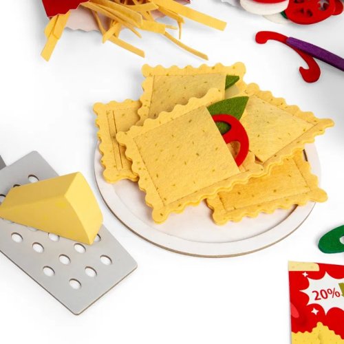 Tato 64dílná dětská potravinová sada obsahuje vše, co Vaše děti potřebují k tomu, aby mohli použít svou kulinářskou představivost. Sada obsahuje dřevěnou misku a talíř, dvě vidličky, struhadlo na sýr s plátkem parmazánu, měkké plstěné ingredience jako tagliatelle, ravioli či farfalle, obsahuje také různé barevné druhy zeleniny, rajčatovou omáčku, houby nebo lístky bazalky. Součástí sady je také karta s italským menu pro autentický zážitek z restaurace. Když děti připravují a pak servirují svá předstíraná těstovinová jídla, rozvinou si u toho základní dovednosti jako je zručnost, slovní zásoba, kreativita, představivost a vyprávění příběhů. Zlepšují si také své sociální dovednosti. Vyrobeno z prvotřídního a udržitelného dřeva s certifikací FSC® a barveno netoxickými barvami a laky. Splňuje všechny aktuální evropské bezpečnostní normy. Hlavní vlastnosti: 64 dílůhra na role zlepšuje sociální dovednostivyrobeno ze dřeva s certifikací FSC Značka a certifikát FSC® (Forest Stewardship Council) zaručuje, že dřevo, ze kterého byl produkt vyroben, nebylo vytěženo nelegálně a pochází z lesů obhospodařovaných šetrným či přírodě blízkým způsobem, ve kterém jsou dodržovány přísné environmentální a sociální požadavky. Značka FSC® na výrobku znamená, že svým nákupem pomáháte chránit lesy a podporujete šetrné, odpovědné či přírodě blízké hospodaření, díky kterému jsou naše lesy stabilnější, zdravější, mají přirozenou druhovou skladbu a lépe odolávají negativním následkům klimatických změn.