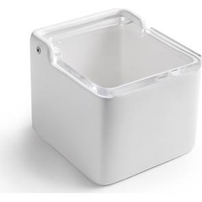 Keramická dóza na sůl s plastovým víkem působí v kuchyni čistě a elegantně.