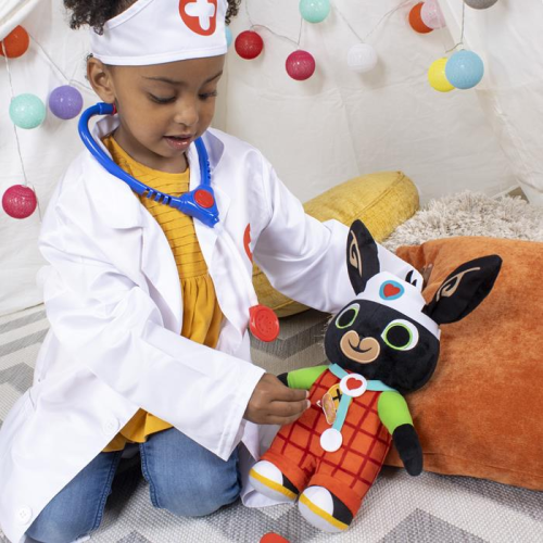 Králíček Bing se jistě rychle stane jedním z nejoblíbenějších kamarádů vašeho dítěte. Tento plyšový králík je díky měkkému, na dotek příjemnému materiálu a vyšívané tváři bezpečný i pro nejmenší děti. Je vybavený svoji doktorskou brašnou, stetoskopem a lékařským čepečkem. Při každé hře na doktora bude hrát hlavní roli. Vhodné pro děti od 12 měsíců. Hračka je vyrobena z měkké plyše.