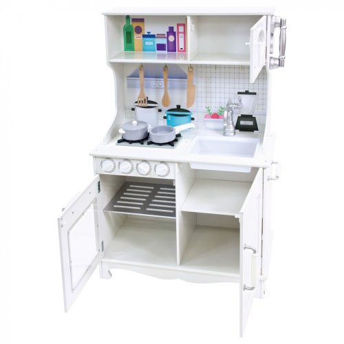 Dětská kuchyňka ve středomořském stylu, vybavená dřezem, sporákem a troubou včetně mikrovlnné. Sporák disponuje otočnými knoflíky, které dodají hrám Vašich dětí na autenticitě. Prostor nad linkou a pod dřezem skýtá objemné úložné prostory. Na pravém boku je umístěn telefon. Kuchyňka je dodávána včetně příslušenství, nádobí i náčiní. Hračka je robustní a odolná, vyrobena ze silné překližky a masivního dřeva. Hlavní vlastnosti:kuchyňka s telefonem, hrnec s poklicí, pánev, vařečka, obracečka, nůž a vidličkadřez, sporák, trouba a mikrovlnná troubaúložné prostoryrobustní dřevěné provedení