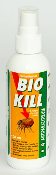 Sanace prostředí: Přípravek BIO KILL 2,5 mg/ml sprej působí též v rámci prevence napadení výše uvedenými druhy. Kontraindikace: Nepoužívat u koček – přípravek je pro kočky toxický. Zamezte možnému styku koček se psy, kteří jsou ošetřeni přípravkem BIO KILL 2,5 mg/ml sprej. Nežádoucí účinky: Nejsou známy. Cílový druh zvířat: Psi, morčata, křečci, exotičtí ptáci. Dávkování pro každý druh, cesta a způsob podání: Způsob podání: Zvířata - prostředek se aplikuje proti směru srsti a peří, až se jejich kůže (peří) navlhčí. Dlouhosrstá zvířata se současně kartáčují. Dávkování: 10 mg permethrinu (tj. 4 ml přípravku) na 1 kg hmotnosti zvířete, tedy: