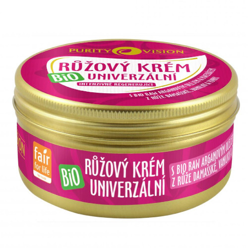 Bio univerzální růžový krém s vůní růže a vanilky má regenerační, vyživující a hydratační účinky. Hlavní složkou je BIO bambucké máslo, které díky vysokému obsahu vitamínů a nenasycených mastných kyselin hloubkově vyživuje a regeneruje pokožku a účinně působí proti stárnutí. Díky čistě přírodnímu složení je krém vhodný pro všechny typy pleti, včetně citlivé.