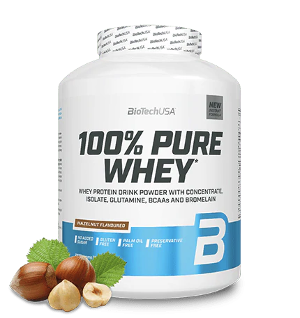 100% Pure Whey je vysoce kvalitní proteinový prášek s vysokou biologickou hodnotou. Je kombinací syrovátkového koncentrátu, syrovátkového izolátu a přidaných aminokyselin (L-glutamin, L-arginin a BCAA). Díky nízkému obsahu sacharidů a tuků je vhodný i v dietní fázi. Neobsahuje lepek, palmový olej, ani přidaný cukr. K dostání je v pestré škále příchutí. Přednosti: