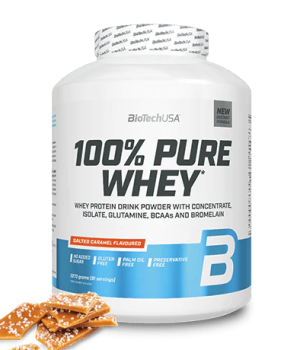 100% Pure Whey je vysoce kvalitní proteinový prášek s vysokou biologickou hodnotou. Je kombinací syrovátkového koncentrátu, syrovátkového izolátu a přidaných aminokyselin (L-glutamin, L-arginin a BCAA). Díky nízkému obsahu sacharidů a tuků je vhodný i v dietní fázi. Neobsahuje lepek, palmový olej, ani přidaný cukr. K dostání je v pestré škále příchutí. Přednosti:
