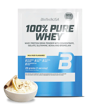 100% Pure Whey je vysoce kvalitní proteinový prášek s vysokou biologickou hodnotou. Je kombinací syrovátkového koncentrátu, syrovátkového izolátu a přidaných aminokyselin (L-glutamin, L-arginin a BCAA). Díky nízkému obsahu sacharidů a tuků je vhodný i v dietní fázi. Neobsahuje lepek, palmový olej, ani přidaný cukr. K dostání je v pestré škále příchutí. Přednosti:
