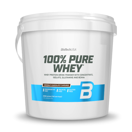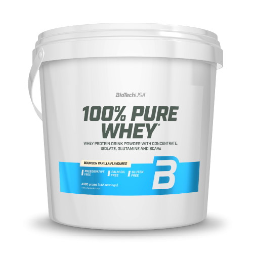 100% Pure Whey je vysoce kvalitní proteinový prášek s vysokou biologickou hodnotou. Je kombinací syrovátkového koncentrátu, syrovátkového izolátu a přidaných aminokyselin (L-glutamin, L-arginin a BCAA). Díky nízkému obsahu sacharidů a tuků je vhodný i v dietní fázi. Neobsahuje lepek, palmový olej, ani přidaný cukr. K dostání je v pestré škále příchutí. Přednosti: