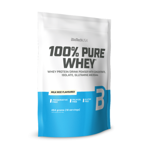 100% Pure Whey je vysoce kvalitní proteinový prášek s vysokou biologickou hodnotou. Je kombinací syrovátkového koncentrátu, syrovátkového izolátu a přidaných aminokyselin (L-glutamin, L-arginin a BCAA). Díky nízkému obsahu sacharidů a tuků je vhodný i v dietní fázi. Neobsahuje lepek, palmový olej, ani přidaný cukr. K dostání je v pestré škále příchutí. Přednosti: