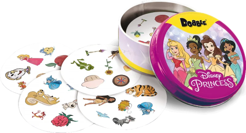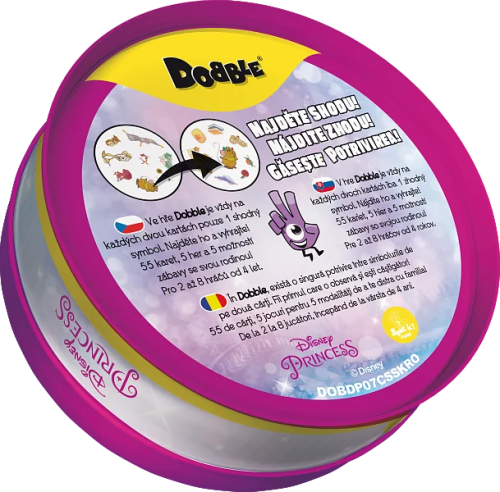 Oblíbená postřehová hra Dobble na motivy Disney princezen, postaviček a charakterů. Rychlost, postřeh, reflexy! Dobble Disney princezny, to je 57 různých symbolů, 55 karet, 8 obrázků na kartě a každé dvě karty spolu mají společný jen jeden obrázek! Hra je kompletně v češtině i slovenštině a nabízí zcela unikátní zábavu. Děti zde hledají dva stejné obrázky na kartách při různých verzích hry (v pravidlech je popsáno celkem 5 her). Super jsou kulaté karty i jednoduchá pravidla vysvětlená doslova za pár sekund. Hra je určená především pro děti, ale i jejich rodiče - zkrátka pro všechny, kteří se chtějí pořádně bavit a nemají čas pročítat dlouhá pravidla. Plechová krabička zaručuje bezpečí karet a jednoduše umožňuje mít hru vždy u sebe. Vyzkoušejte i Vy postřehový fenomén Dobble a jistě budete překvapeni, jak i tak jednoduchá hra může být zábavná! V pravidlech naleznete popsaných všech 57 různých symbolů. Obsah balení: 55 karet v plechové krabičce 1 česká, slovenská a rumunská pravidla