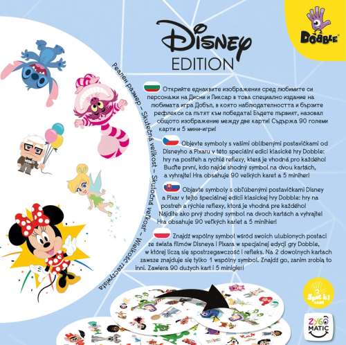 Objevte symboly s vašimi oblíbenými postavičkami od Disneyho a Pixaru v této speciální edici klasické hry Dobble: hry na postřeh a rychlé reflexy, která je vhodná pro každého. Buďte první, kdo najde shodný symbol na dvou kartách, a vyhrajte. Hra obsahuje 90 velkých karet (větších než u klasické hry Dobble) a 5 miniher. Na každé z 90 kartiček se nachází 10 symbolů. Celkem je ve hře 91 jedinečných symbolů. Na dvou libovolných kartách je vždy pouze jeden symbol stejný. Oproti zvyklostem není tento Dobble balen v plechové krabičce.