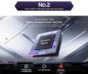 Procesor: Unisoc T8100 (6nm), osmijádrový, 5G konektivita