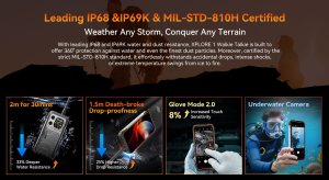 Odolnost: IP68, IP69K, MIL-STD-810H (voda, prach, mráz, pád z 1,5 m)