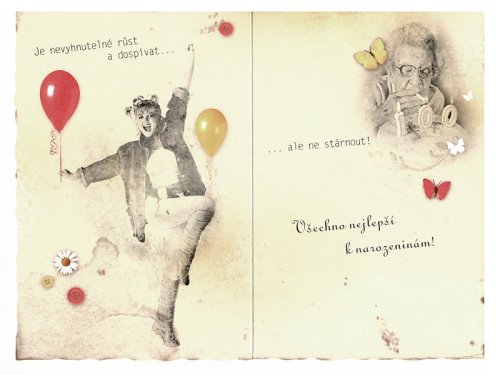 Papírové blahopřání k narozeninám s textem a motivy v retro stylu.