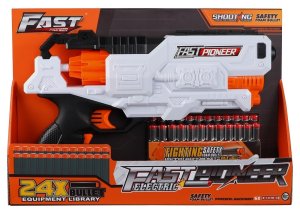 Blaster Fast na baterie s dostřelem 10–15m. Balení obsahuje pistoli a 24 ks nábojů. Náboj je z měkkého materiálu a s kulatou hlavou pro bezpečné střílení. Náboj je vyroben z pěnového materiálu a lze je recyklovat. Dlouhá vzdálenost dostřelu. Kapacita zásobníku: 7 nábojů.