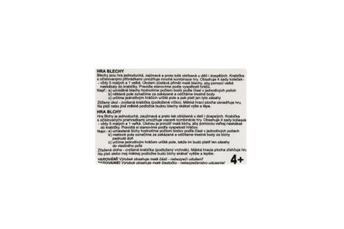 Dětská hra - Blechy - skvělá hra pro malé i velké. Blechy jsou jednoduchá hra, která je velmi oblíbená. Krabička s očíslovanými přihrádkami umožňuje řadu kombinací hry. Obsahuje 4 sady koleček - vždy pět malých a jedno velké. Úkolem zůstává přimět malé blechy, aby pomocí velké naskákaly do krabičky. Vše vyrobeno z barevného plastu. Doporučený věk 4+