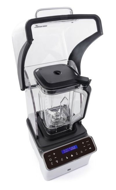 Po uzavření mixovací nádoby se surovinami sklopíte odhlučňovací kryt, jedním dotykem spustíte vakuování a poté můžete mixovat.