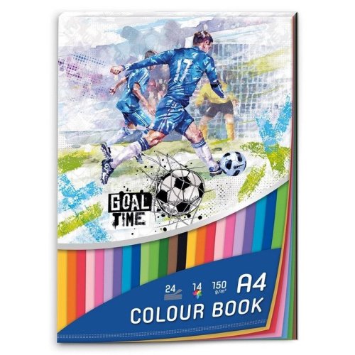 Blok barevného papíru velikosti A4 GOAL TIME. <br> • blok obsahuje 24 barevných listů v 14 barvách <br> • list barevného papíru váží 150g <br> • vhodné jsou na výtvarní výchovu a kreativní tvoření zvláště pro pevnější gramáž papíru