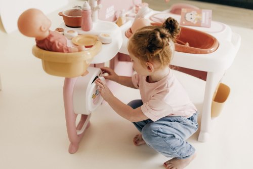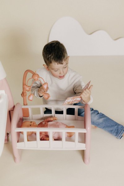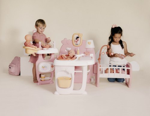 Hrací centrum pro panenky Baby Nurse se 3 hracími zónami je vybaveno transportními kolečky, rukojetí a je skládací pro snadnou přepravu. Po otevření překvapí třemi prostornými hracími koutky: kuchyňkou, koupelnou a ložnicí. Mycí prostor je vybaven odnímatelnou vaničkou, hned vedle je přebalovací pult, který zároveň slouží jako šatna. Pod komodou je věšák na ručníky, háček na kabát a vyjímatelný odpadkový koš. Rám obrazu na zadní stěně lze přizpůsobit vlastními fotografiemi. Jídelní kout se sedátkem pro panenky má dřez s baterií (nefunkční), varnou desku, mikrovlnnou troubu a odkládací police. Spací část obsahuje postýlku pro panenky, otočný kolotoč a fosforeskující lampu. Příslušenství: lahvičky, talíře se lžičkami, hrnce, klinické teploměry a různé nádoby a prázdné obaly na hraní. Vhodné pro panenky do 42 cm (panenka není součástí balení). Tento výrobek obsahuje minimálně 78 % recyklovaného materiálu. Rozměry složeného produktu (DxŠxV): 68 x 71 x 71 cm. Rozměry produktu v rozloženém stavu (DxŠxV): 149 x 71 x 71 cm.