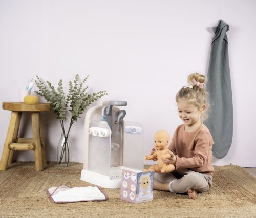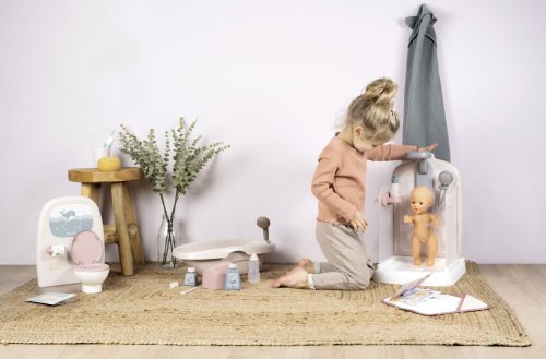 Sprchový kout pro panenky Baby Nurse s funkční sprchovou hlavicí, funkce proudu vody díky čerpadlu a nádrži na vodu. Sprcha má držák na ručník, háčky na župany, poličku, pevnou sprchu, hlavici a řada dalšího příslušenství. Vhodné pro panenky do 40 cm (panenka není součástí balení). Rozměry produktu (DxŠxV): 30,9 x 29,9 x 46,6 cm. Hmotnost 1,845 kg.