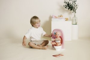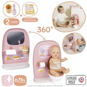 Koupelna pro panenky z řady Baby Nurse. Obsahuje toaletu, roli toaletního papíru, umyvadlo, zrcadlo, kartáček na zuby a kelímek. Panenka není součástí balení. Vhodné pro panenky do 42 cm. Tento výrobek obsahuje minimálně 75 % recyklovaného materiálu. Rozměry rozbaleného výrobku (DxŠxV): 22 x 25 x 34 cm.