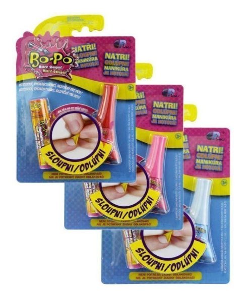 Užijte si krásné nehty se slupovacími laky Bo-Po. Je to vážně jednoché. Už žádný odlakovač. Naneste lak, nechte ho zaschnout. Chcete si užít novou barvu? Lak jednoduše sloupněte. Pozor! Tato sada obsahuje jeden lak, ale také balzám na rty, který mění barvu. Obsahuje: 1 Bo-Po lak a 1 balzám na rty (Zmrzlina nebo Mango)