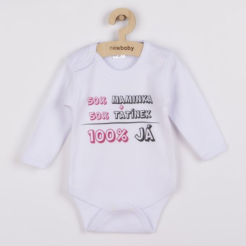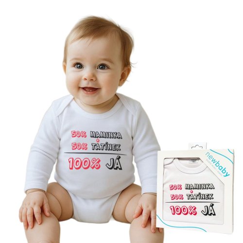 Originální bavlněné kojenecké body s dlouhým rukávem New Baby, s vtipným nápisem 50% MAMINKA + 50% TATÍNEK - 100% JÁ. Body má kolem krčku, nožiček a ručiček barevné lemování. Barvy použité k potisku jsou certifikované a vhodné pro miminka. Je vyrobeno z příjemného a kvalitního materiálu, ve kterém se bude Vaše miminko cítit příjemně. Body má zapínáni na cvočky na ramínku a mezi nožičkami, což usnadňuje oblékání a přebalování. Dopřejte Vašemu miminku vyniknout v originálním body. Složení: 100% bavlna. Rozměry: obvod kolem hrudníku cca 42 cm, délka rukávu cca 23 cm, celková délka cca 38 cm.<BR>- Produkt české značky