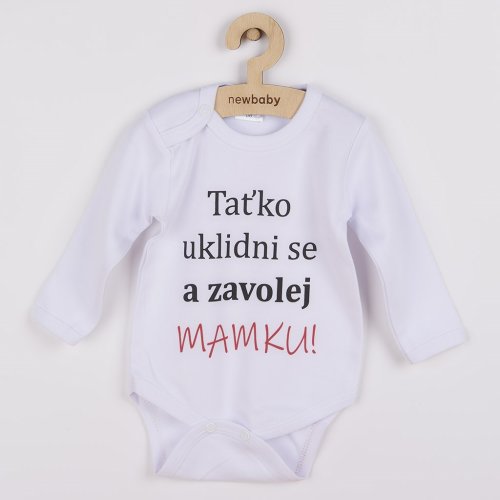 Originální bavlněné kojenecké body s dlouhým rukávem New Baby, s vtipným nápisem Taťko uklidni se a zavolej MAMKU! Barvy použité k potisku jsou certifikované a vhodné pro miminka. Je vyrobeno z příjemného a kvalitního materiálu, ve kterém se bude Vaše miminko cítit příjemně. Body má zapínáni na cvočky na ramínku a mezi nožičkami, což usnadňuje oblékání a přebalování. Dopřejte Vašemu miminku vyniknout v originálním body. Složení: 100% bavlna. Rozměry: obvod kolem hrudníku cca 42 cm, délka rukávu cca 23 cm, celková délka cca 38 cm.