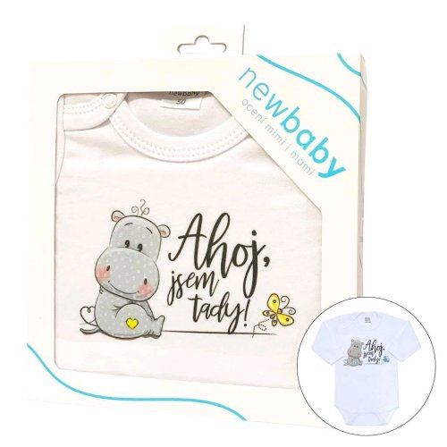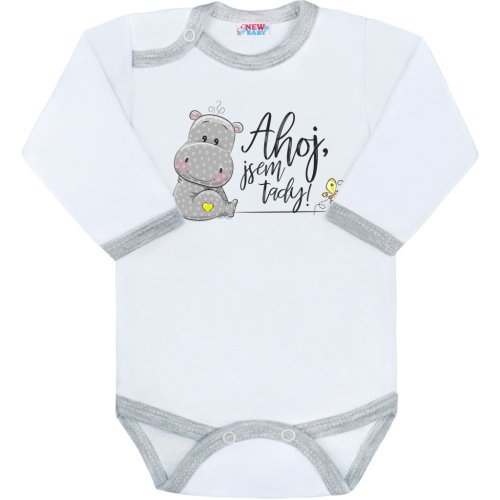 Originální bavlněné kojenecké body s dlouhým rukávem New Baby, s roztomilým obrázkem a nápisem Ahoj, jsem tady! Body má kolem krčku, nožiček a ručiček barevné lemování. Barvy použité k potisku jsou certifikované a vhodné pro miminka. Je vyrobeno z příjemného a kvalitního materiálu, ve kterém se bude Vaše miminko cítit příjemně. Body má zapínáni na cvočky na ramínku a mezi nožičkami, což usnadňuje oblékání a přebalování. Dopřejte Vašemu miminku vyniknout v originálním body. Složení: 100% bavlna. Rozměry: obvod kolem hrudníku cca 50 cm, délka rukávu cca 26 cm, celková délka cca 42 cm.