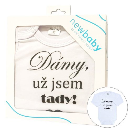 Originální bavlněné kojenecké body s dlouhým rukávem New Baby, s vtipným nápisem Dámy, už jsem tady! Barvy použité k potisku jsou certifikované a vhodné pro miminka. Je vyrobeno z příjemného a kvalitního materiálu, ve kterém se bude Vaše miminko cítit příjemně. Body má zapínáni na cvočky na ramínku a mezi nožičkami, což usnadňuje oblékání a přebalování. Dopřejte Vašemu miminku vyniknout v originálním body. Složení: 100% bavlna. Rozměry: obvod kolem hrudníku cca 34 cm, délka rukávu cca 16 cm, celková délka cca 30 cm.<BR>- Produkt české značky