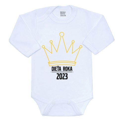 Originální bavlněné kojenecké body s dlouhým rukávem New Baby, s vtipným nápisem DIEŤA ROKA 2023. Barvy použité k potisku jsou certifikované a vhodné pro miminka. Je vyrobeno z příjemného a kvalitního materiálu, ve kterém se bude Vaše miminko cítit příjemně. Body má zapínáni na cvočky na ramínku a mezi nožičkami, což usnadňuje oblékání a přebalování. Dopřejte Vašemu miminku vyniknout v originálním body. Složení: 100% bavlna. Rozměry: obvod kolem hrudníku cca 34 cm, délka rukávu cca 16 cm, celková délka cca 30 cm.<BR>- Produkt české značky