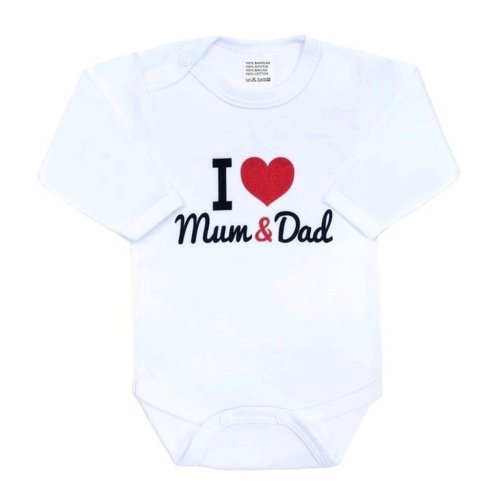Originální bavlněné kojenecké body s dlouhým rukávem New Baby, s vtipným nápisem I love Mum and Dad. Barvy použité k potisku jsou certifikované a vhodné pro miminka. Je vyrobeno z příjemného a kvalitního materiálu, ve kterém se bude Vaše miminko cítit příjemně. Body má zapínáni na cvočky na ramínku a mezi nožičkami, což usnadňuje oblékání a přebalování. Dopřejte Vašemu miminku vyniknout v originálním body. Složení: 100% bavlna. Rozměry: obvod kolem hrudníku cca 34 cm, délka rukávu cca 16 cm, celková délka cca 30 cm.<BR>Produkt české značky