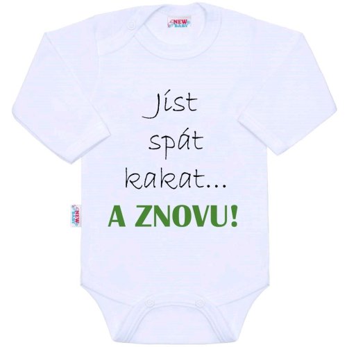 Originální bavlněné kojenecké body s dlouhým rukávem New Baby, s vtipným nápisem jíst spát kakat... A ZNOVU! Barvy použité k potisku jsou certifikované a vhodné pro miminka. Je vyrobeno z příjemného a kvalitního materiálu, ve kterém se bude Vaše miminko cítit příjemně. Body má zapínáni na cvočky na ramínku a mezi nožičkami, což usnadňuje oblékání a přebalování. Dopřejte Vašemu miminku vyniknout v originálním body. Složení: 100% bavlna. Rozměry: obvod kolem hrudníku cca 46 cm, délka rukávu cca 24 cm, celková délka cca 40 cm.
