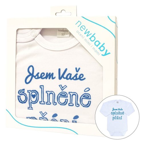 Originální bavlněné kojenecké body s dlouhým rukávem New Baby, s vtipným nápisem Jsem Vaše splněné přání. Barvy použité k potisku jsou certifikované a vhodné pro miminka. Je vyrobeno z příjemného a kvalitního materiálu, ve kterém se bude Vaše miminko cítit příjemně. Body má zapínáni na cvočky na ramínku a mezi nožičkami, což usnadňuje oblékání a přebalování. Dopřejte Vašemu miminku vyniknout v originálním body. Složení: 100% bavlna. Rozměry: obvod kolem hrudníku cca 34 cm, délka rukávu cca 16 cm, celková délka cca 30 cm.