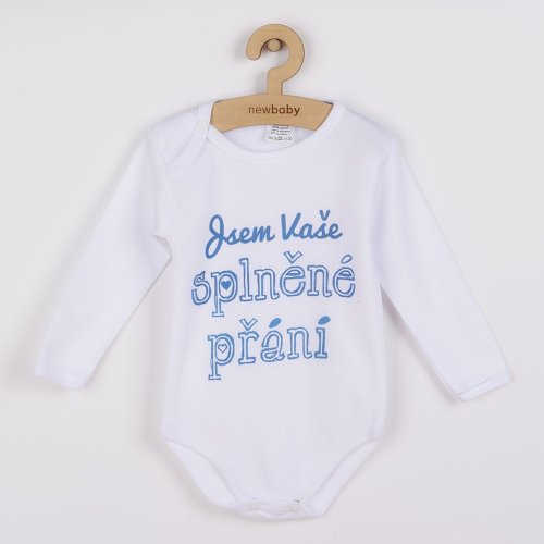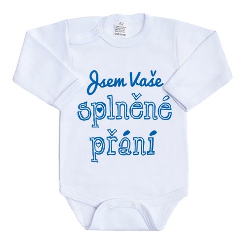 Originální bavlněné kojenecké body s dlouhým rukávem New Baby, s vtipným nápisem Jsem Vaše splněné přání. Barvy použité k potisku jsou certifikované a vhodné pro miminka. Je vyrobeno z příjemného a kvalitního materiálu, ve kterém se bude Vaše miminko cítit příjemně. Body má zapínáni na cvočky na ramínku a mezi nožičkami, což usnadňuje oblékání a přebalování. Dopřejte Vašemu miminku vyniknout v originálním body. Složení: 100% bavlna. Rozměry: obvod kolem hrudníku cca 46 cm, délka rukávu cca 24 cm, celková délka cca 40 cm.