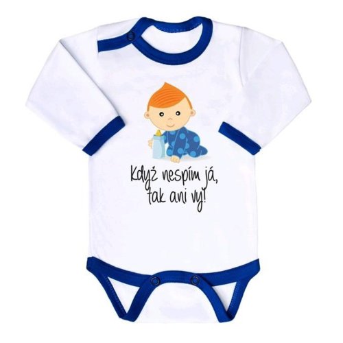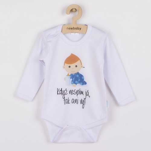 Originální bavlněné kojenecké body s dlouhým rukávem New Baby, s vtipným nápisem Když nespím já, tak ani vy! A obrázkem roztomilého chlapečka. Body má kolem krčku, nožiček a ručiček barevné lemování. Barvy použité k potisku jsou certifikované a vhodné pro miminka. Je vyrobeno z příjemného a kvalitního materiálu, ve kterém se bude Vaše miminko cítit příjemně. Body má zapínáni na cvočky na ramínku a mezi nožičkami, což usnadňuje oblékání a přebalování. Dopřejte Vašemu miminku vyniknout v originálním body. Složení: 100% bavlna. Rozměry: obvod kolem hrudníku cca 36 cm, délka rukávu cca 18 cm, celková délka cca 32 cm.<BR>- Produkt české značky