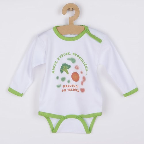 Originální bavlněné kojenecké body s dlouhým rukávem New Baby, s vtipným nápisem Mrkev, květák, brokoličku ... maluju si po tělíčku. Body má kolem krčku, nožiček a ručiček barevné lemování. Barvy použité k potisku jsou certifikované a vhodné pro miminka. Je vyrobeno z příjemného a kvalitního materiálu, ve kterém se bude Vaše miminko cítit příjemně. Body má zapínáni na cvočky na ramínku a mezi nožičkami, což usnadňuje oblékání a přebalování. Dopřejte Vašemu miminku vyniknout v originálním body. Složení: 100% bavlna. Rozměry: obvod kolem hrudníku cca 36 cm, délka rukávu cca 18 cm, celková délka cca 32 cm.<BR>Produkt české značky