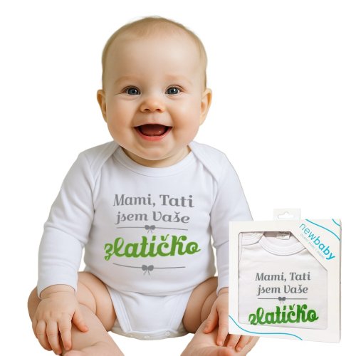 Originální bavlněné kojenecké body s dlouhým rukávem New Baby, s vtipným nápisem Mami, Tati jsem Vaše zlatíčko. Barvy použité k potisku jsou certifikované a vhodné pro miminka. Je vyrobeno z příjemného a kvalitního materiálu, ve kterém se bude Vaše miminko cítit příjemně. Body má zapínáni na cvočky na ramínku a mezi nožičkami, což usnadňuje oblékání a přebalování. Dopřejte Vašemu miminku vyniknout v originálním body. Složení: 100% bavlna. Rozměry: obvod kolem hrudníku cca 50 cm, délka rukávu cca 26 cm, celková délka cca 42 cm.<BR>Produkt české značky