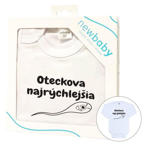 Originální bavlněné kojenecké body s dlouhým rukávem New Baby, s vtipným nápisem OTECKOVA NAJRÝCHLEJŠIA. Barvy použité k potisku jsou certifikované a vhodné pro miminka. Je vyrobeno z příjemného a kvalitního materiálu, ve kterém se bude Vaše miminko cítit příjemně. Body má zapínáni na cvočky na ramínku a mezi nožičkami, což usnadňuje oblékání a přebalování. Dopřejte Vašemu miminku vyniknout v originálním body. Složení: 100% bavlna. Rozměry: obvod kolem hrudníku cca 50 cm, délka rukávu cca 26 cm, celková délka cca 42 cm.<BR>Produkt české značky