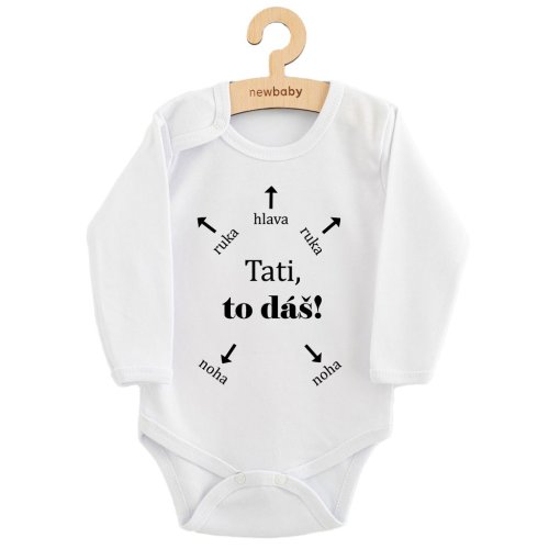 Originální bavlněné kojenecké body s dlouhým rukávem New Baby, s vtipným nápisem Tati, to dáš! Barvy použité k potisku jsou certifikované a vhodné pro miminka. Je vyrobeno z příjemného a kvalitního materiálu, ve kterém se bude Vaše miminko cítit příjemně. Body má zapínáni na cvočky na ramínku a mezi nožičkami, což usnadňuje oblékání a přebalování. Dopřejte Vašemu miminku vyniknout v originálním body. Složení: 100% bavlna. Rozměry: obvod kolem hrudníku cca 42 cm, délka rukávu cca 23 cm, celková délka cca 38 cm.<BR>Produkt české značky