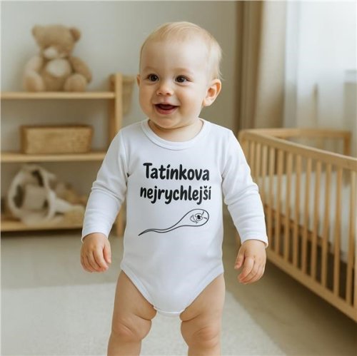 Originální bavlněné kojenecké body s dlouhým rukávem New Baby, s vtipným nápisem TATÍNKOVA NEJRYCHLEJŠÍ. Barvy použité k potisku jsou certifikované a vhodné pro miminka. Je vyrobeno z příjemného a kvalitního materiálu, ve kterém se bude Vaše miminko cítit příjemně. Body má zapínáni na cvočky na ramínku a mezi nožičkami, což usnadňuje oblékání a přebalování. Dopřejte Vašemu miminku vyniknout v originálním body. Složení: 100% bavlna. Rozměry: obvod kolem hrudníku cca 34 cm, délka rukávu cca 16 cm, celková délka cca 30 cm.<BR>- Produkt české značky