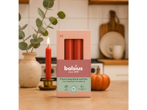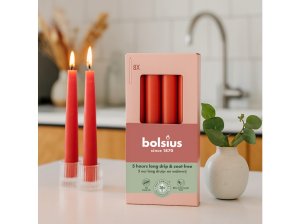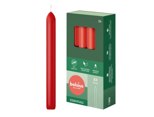 Kvalitní stolní svíčky vyrobené z přírodního veganského vosku bez obsahu palmového oleje. Hoří čistě a rovnoměrně bez nadměrného kouření. Díky klasickému tvaru jsou vhodné pro stolní svícny i sváteční aranžmá. Ideální pro každodenní použití i slavnostní příležitosti. Balení obsahuje 8 kusů. Doba hoření: přibližně 5 hodin. Barva: červená.