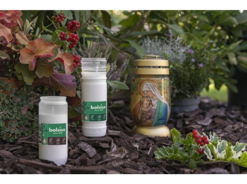 Tato svíčka s mozaikou Marie nabízí 36 hodin hoření a je ideální pro náboženské obřady na hřbitově. Její rozměry jsou 23 cm.