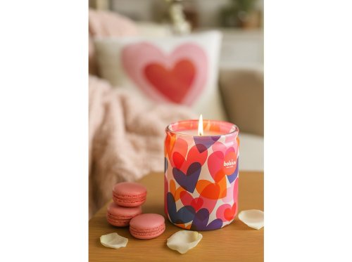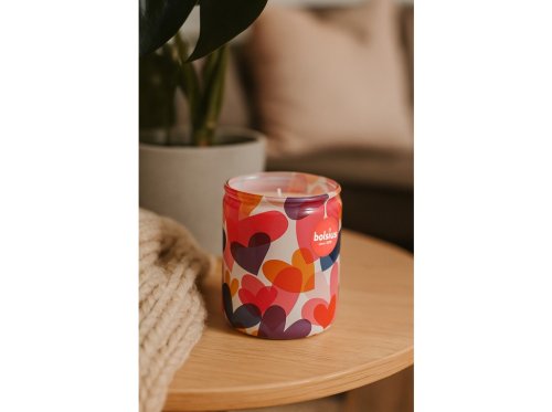 Vonná svíčka s levandulovou vůní a barevnými srdíčky v skleněné nádobě, ideální pro romantické večery.