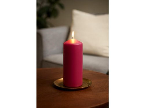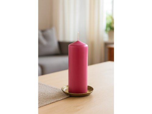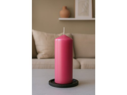 Růžová válcová svíčka, ideální pro vytváření příjemné atmosféry. Její rozměry jsou 60 x 150 mm.