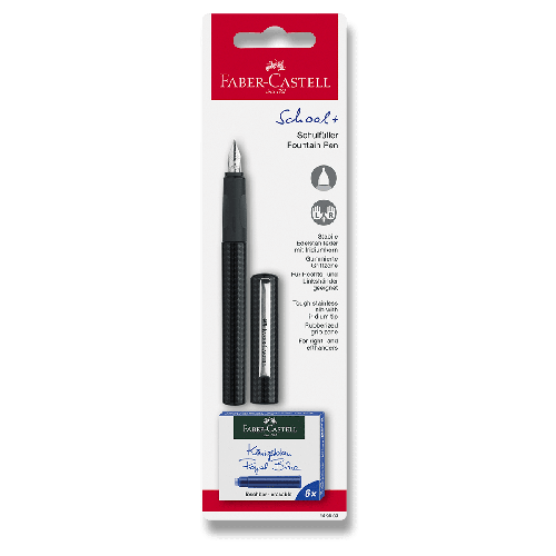 • ergonomická univerzální oblast úchopu z měkkého materiálu podporující správné držení třemi prsty, * kvalitní iridiový hrot pera M – odolný i vůči vyššímu tlaku, * standardní inkoustové bombičky součástí balení, * okénko pro kontrolu obsahu inkoustové náplně v bombičce, Tip: Pořiďte si rovnou náhradní inkoustové bombičky Faber-Castell.