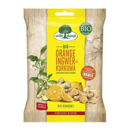 Bonbony Willi Dungl Orange, plněné furé s příchutí pomeranče, zázvoru a kurkumy Bio bonbony obsahují vysoce kvalitní suroviny z ekologického zemědělství, zázvor a kurkuma dodávají bonbonům pikantní svěžest, …
