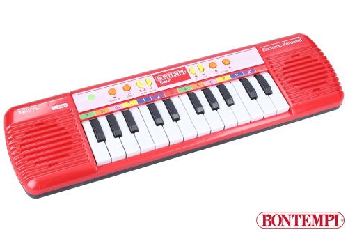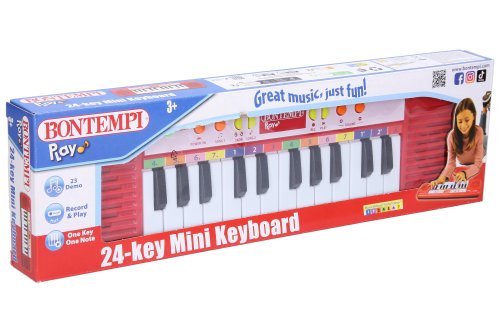 Bontempi Klávesy mini. 24 kláves, 10 melodií, 7 melodií s doprovodem, funkce učení, funkce nahrávání a zpětného přehrání, kontrola hlasitosti, automatické vypnutí. Baterie 2xAA/R6, 1,5V, nejsou součástí.