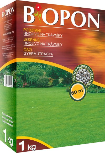 Vícesložkové hnojivo určené k podzimnímu přihnojování trávníků. Vyvážený poměr výživy před zimou zvyšuje odolnost vůči mrazu. Složení: poměr prvků 10%P : 20%K : 4%Mg : 10%S. Termín aplikace VIII - X. V dávce: trávník trvalý 20-40 g na m2 (do posekaného trávníku se rovnoměrně rozsype odměřené hnojivo a vydatně zalije). Trávník nově založený 30-60 g na m2 (do právě založeného trávníku se rovnoměrně rozsype odměřené hnojivo a vydatně zalije). Aplikace: rozhození rovnoměrně kolem dřeviny, se zapravením do vrchní vrstvy země s následným zalitím pro aktivaci hnojiva. 1 kg hnojiva postačí na 50 m2.
