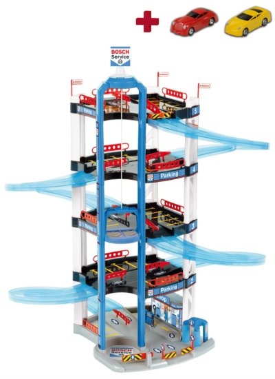 Garáž Bosch, 5 pater. Moderní garáž s čerpací stanicí a myčkou. Z horní části mohou autíčka závodit, kdo dojede dolu dřív. Včetně dvou autíček, Výška 85 cm. Vhodné pro děti od 3 let.