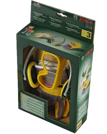 Sada pracovních pomůcek. Brýle, sluchátka a pracovní rukavice. Vše značky Bosch. Velikost balení 19x7x33 cm. Vhodné pro děti od 3 let.